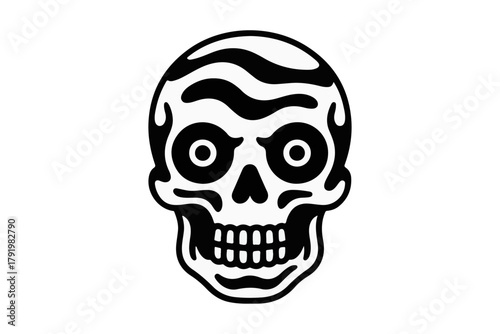 A stark black and white illustration of a skull, featuring distinctive wavy lines across its forehead and expressive, wide-open eyes, with a detailed representation of teeth