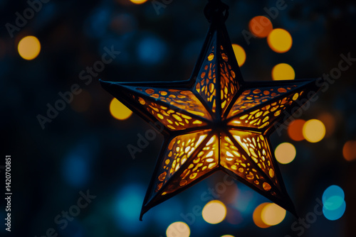A star-shaped lantern with sharp, angular edges emits a bright light, which pierces the surrounding darkness and spreads a warm glow.