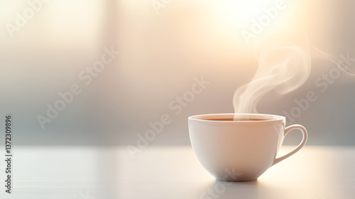 A steaming cup of coffee sits on a table, creating a warm and inviting atmosphere.