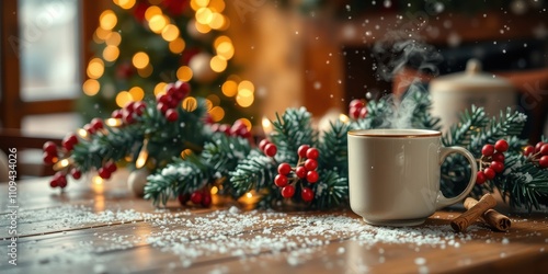 A steaming mug of hot beverage nestled amongst festive greenery, with a backdrop of a twinkling Christmas tree and falling snowflakes.