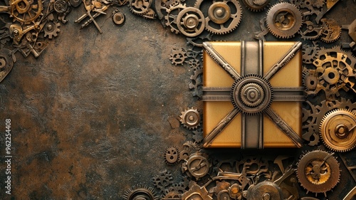 A steampunk-themed gift box adorned with metallic gears, resting on a rustic, industrial surface