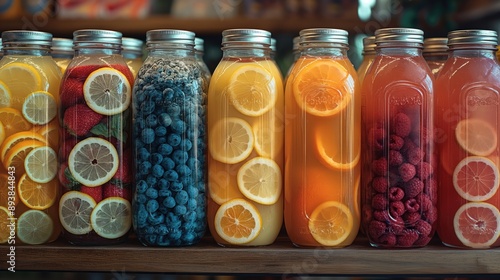 a store shelf full of juice bottles artisanal juices,