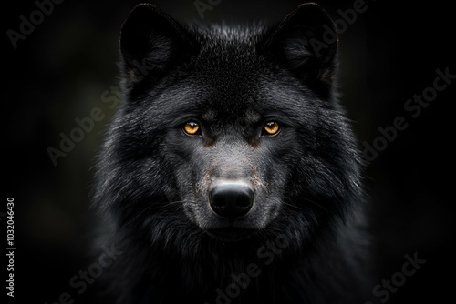 A striking black wolf with intense golden eyes stares directly at the viewer against a dark background, creating a mysterious and powerful presence.