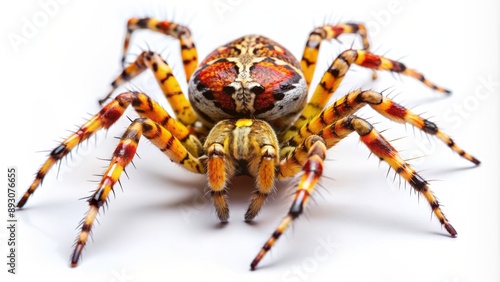 A striking, close-up photograph of a vibrant garden spider, showcasing its intricate body, legs, and distinctive markings on a pure white background.