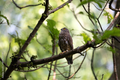 A striking, detailed of a Brown Hawk owl, Brown boobook perched on a dark, mossy branch, set against a beautifully soft, blurred background of lush green tropical foliage.