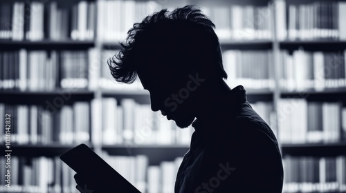 A student s silhouette with a tablet in hand, bright digital literacy content glowing from the screen, minimalist contrast highlighting the act of elearning