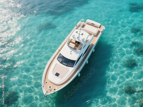 A stunning 8K aerial view of a luxury yacht floating over crystal clear turquoise waters with visible sunlit ripple patterns, showcasing freedom, luxury, and tropical vacation vibes