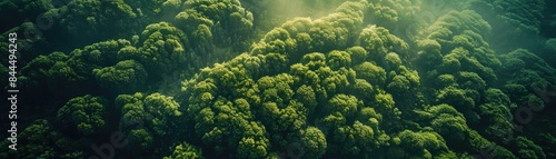 A stunning aerial view of a lush green forest canopy bathed in sunlight, showcasing the beauty of nature and pristine wilderness.