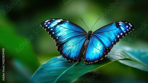 A stunning blue butterfly rests gracefully on a green leaf, showcasing its vibrant wings in a tranquil natural setting, representing the beauty of wildlife.
