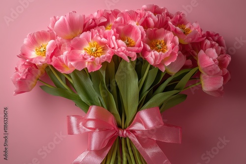 A stunning bouquet of delicate pink flowers, elegantly tied with a soft pink ribbon, radiates romance and beauty, perfect for celebrating love on Valentine's Day.