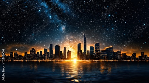 A stunning city skyline at sunset, illuminated by golden hues and a star-filled sky reflected on the water.