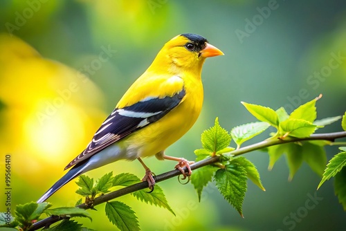 A stunning goldfinch sits atop a branch, embraced by vibrant greenery, glowing under bright natural light, creating a