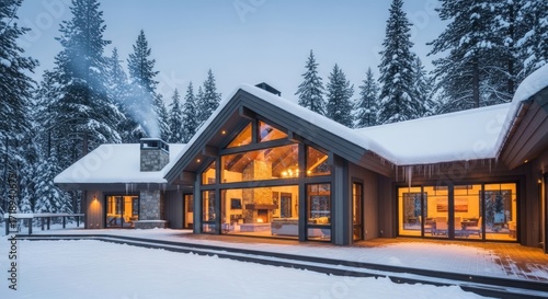 A stunning modern cabin nestled in a snowy winter forest glows warmly from within at twilight.