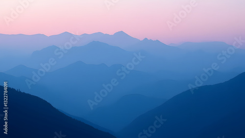 A stunning mountain landscape at dusk, with layers fading into mist and a gradient sky of pink to blue, evoking feelings of awe and the beauty of nature at twilight.