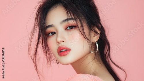 A stunning portrait of a woman with fresh makeup against a soft pink background, radiating beauty and confidence.