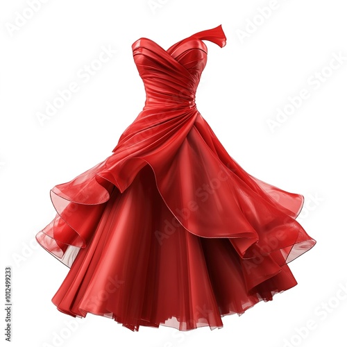 A stunning red party dress design, elegantly isolated on a white background. The dress showcases a sleek silhouette with vibrant red fabric, perfect for special occasions such as formal parties