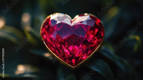 A stunning ruby heart glistens amidst lush green leaves, symbolizing love and passion, capturing the essence of Valentine's Day in a radiant embrace of nature.