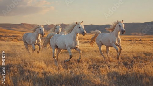 A stunning scene of several white horses running freely across an open meadow, capturing their beauty and power in a vibrant, natural setting.