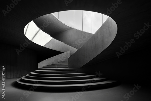A stunning spiral concrete staircase ascends dramatically within a minimalist space, contrasted by light filtering through the overhead circular skylight.