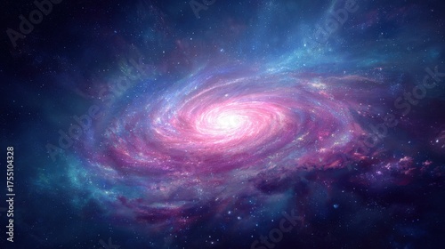 A stunning spiral galaxy sits in the vastness of space featuring vibrant pink and blue colors. Bright light emanates from the center surrounded by swirling clouds of cosmic dust.