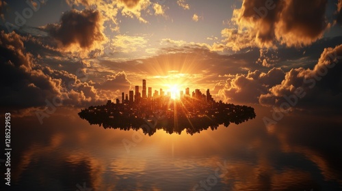 A stunning sunset over a floating cityscape, reflecting on calm waters with dramatic clouds