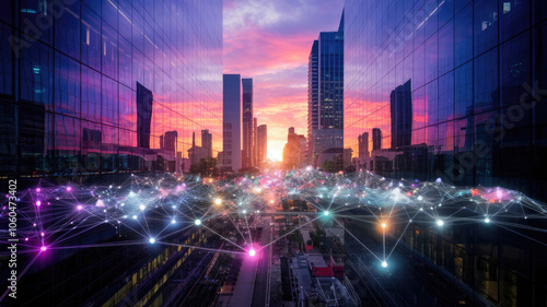 A stunning sunset over a modern cityscape, showcasing a vibrant network of digital connections across skyscrapers, blending technology and urban life.