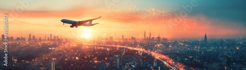 A stunning sunset view of an airplane flying over a city skyline, symbolizing global transportation and logistics