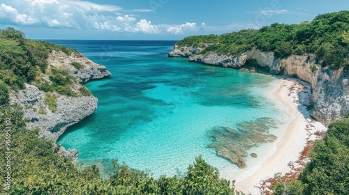 A stunning view of a remote, untouched beach with white sandy shores and crystal-clear turquoise waters. The surrounding cliffs and dense greenery add to the idyllic and pristine nature of this