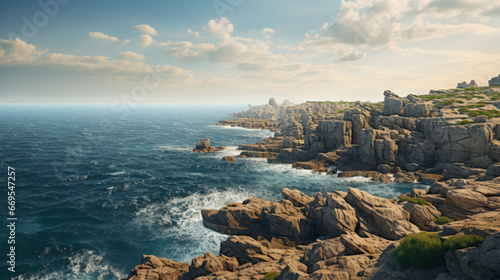 A stunning view of a rocky cliff, overlooking a vast expanse of ocean, with a few fishing boats in the distance
