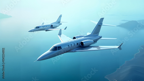 A Stunning View of Two Jets Flying Over a Serene River with Clear Blue Skies and Reflections