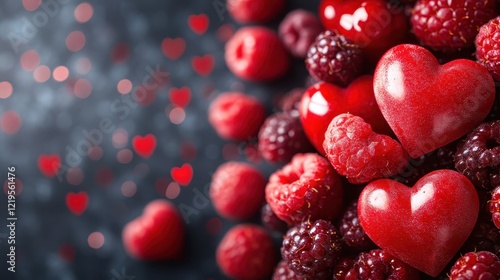 A stunning visual display of heart-shaped treats surrounded by fresh raspberries on a dark surface, evoking deep emotions and the essence of love in every bite.