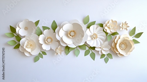 A stunning wall of intricately designed 3D white paper flowers against a clean white background, capturing elegance in high detail and clarity