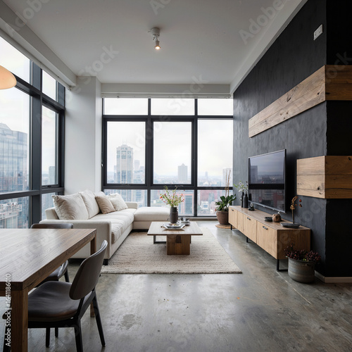 A stylish and contemporary living room featuring a bold black media wall with natural wood accents, creating a perfect focal point for a modern urban apartment.