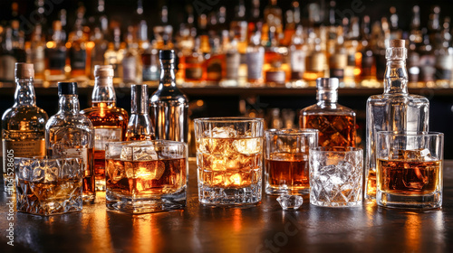 A stylish array of whiskey and rum cocktails on a bar counter illuminated against a dark background, showcasing glassware and bottles in an elegant setup