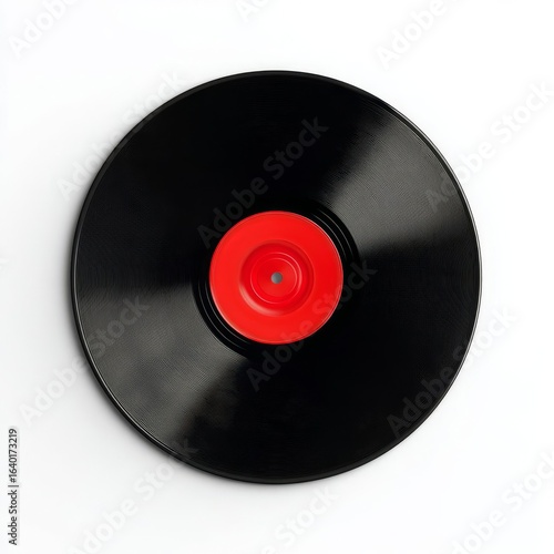 A stylish black vinyl record with a vibrant red center resting on a clean white background inviting nostalgia and music lovers delight