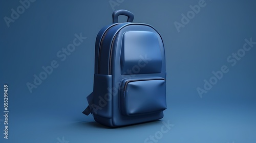 A stylish blue backpack is standing in the middle of a blue background. The backpack is made of high-quality materials and has a sturdy construction.