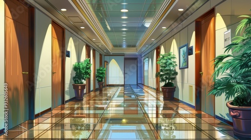 A stylish hotel hallway features glossy floors, decorative plants, and softly lit doors that exude a luxurious ambiance