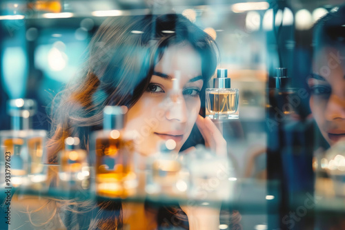 A stylish woman gazes at a perfume bottle inside a cosmetics store, smiling as she examines it. The scene is captured through the display window glass, with lens flares.
