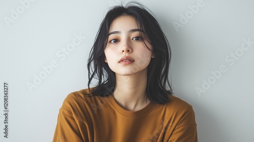 A stylish young Asian woman in a casual brown shirt gazes thoughtfully, her serene expression set against the clean, white background, offering a perfect space for promotional text.