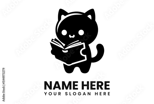 A stylized black cat character happily reading an open book, with text below.