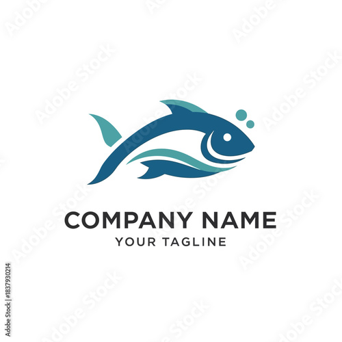 A stylized blue fish logo with waves and bubbles, representing a company name and tagline.