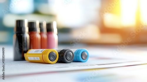 A stylized depiction of ink cartridges and toner bottles, with a focus on the colors and shapes, set against a background of printed pages, high resolution 8K