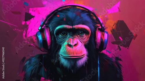 A stylized illustration of a chimpanzee wearing headphones against a vibrant pink and blue background.