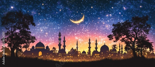 A stylized illustration of a city beneath a starry night sky