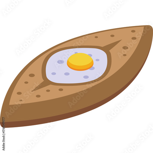 A stylized oval shaped baked pastry with a fried egg in the center on a transparent background with a brown crust and light purple egg white and yellow yolk