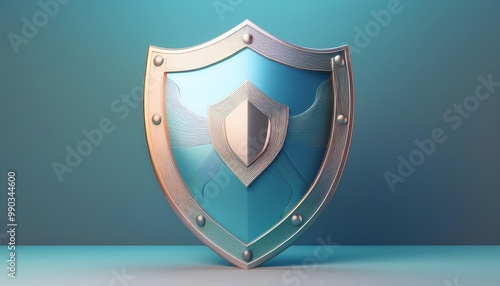 A stylized shield with intricate designs, featuring a metallic sheen and a blue gradient background.