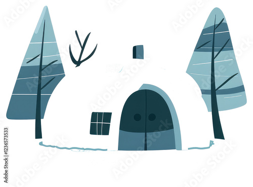 A stylized winter dwelling nestled between two trees