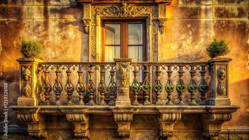 A sunlit stone balcony with ornate balustrade and window, showcasing classic architectural details and a tranquil atmosphere