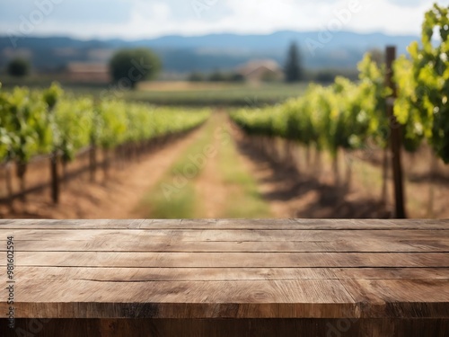 A sunlit vineyard landscape showcasing lush grapevines and a rustic wooden table in focus during golden hour