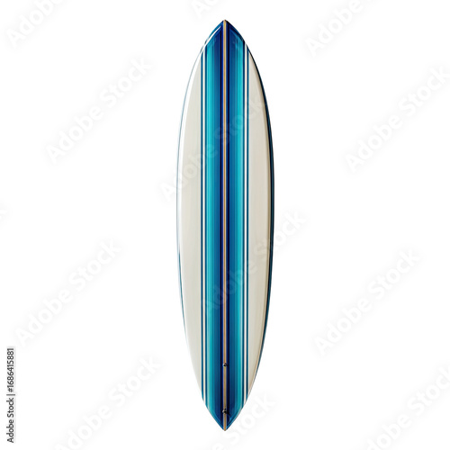 A surfboard, top-down view, light cream/beige color with teal/blue stripes running vertically